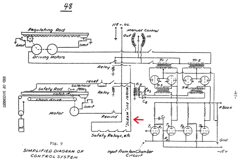 The button was connected to a circuit controlling the release of the “control rods.” These rods were held outside the reactor by magnets; if the magnets were cut, the rods would fall into the reactor, pulled by counterweights.