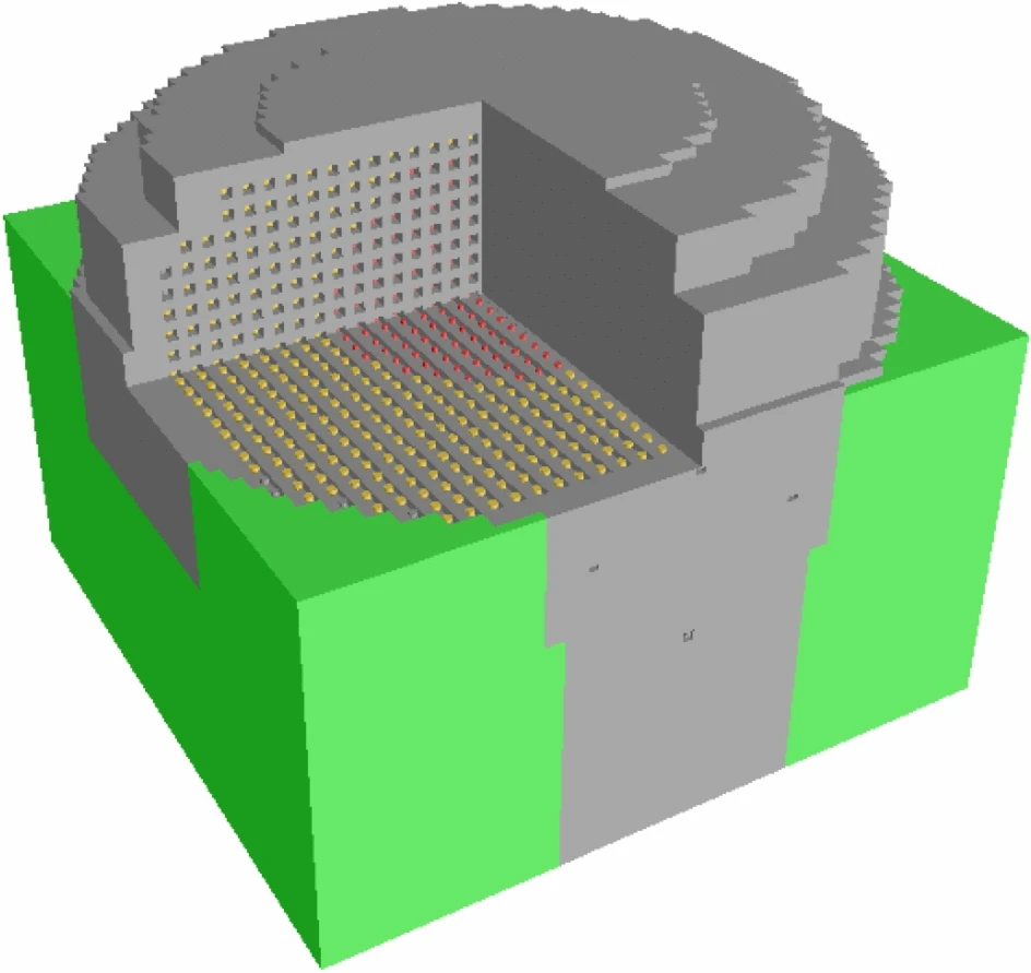 Model of the reactor. The grey material is graphite, while the green one is the wooden scaffold. Yellow dots are uranium oxide (easier to produce, breafly speaking), and red ones are metal uranium.